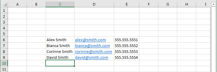 You can use the range feature to select data from a specific portion of the spreadsheet if, for example, you have a sparse spreadsheet that is not top-left aligned or if the data of interest is somewhere in the middle of the sheet. The range is specified as part of the table name. The following command will select the range of cells between C6 and E9: