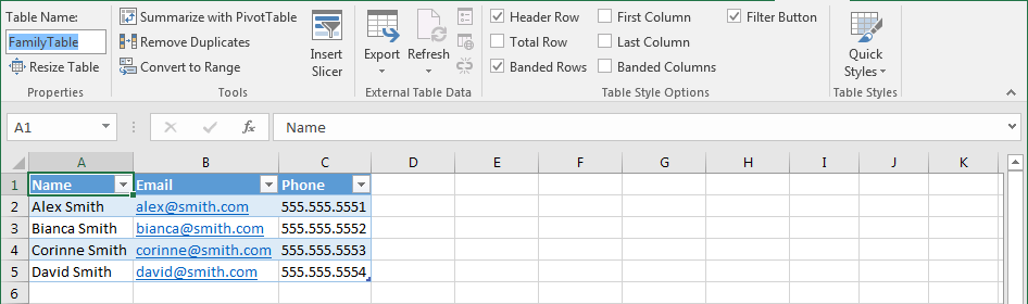 If a spreadsheet has named range defined in it, then you can query this range as if it were a table. You can issue the following query to select data from the named range FamilyTable.