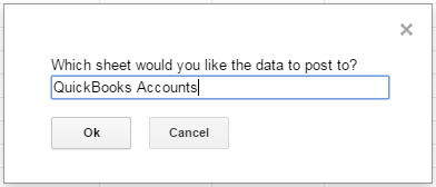 The function below will write the QuickBooks data, using the Google Apps Script JDBC functionality to connect to the MySQL server/daemon, SELECT data, and populate a spreadsheet. When the script is run, two input boxes will appear: