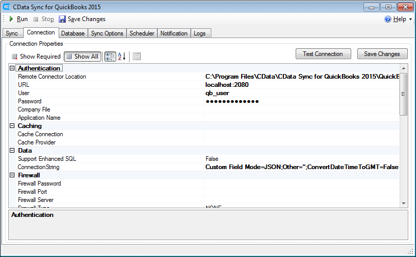 Once you have the product installed, configure the connection to QuickBooks by going to the Connection tab and setting the Remote Connector Location, URL, User, and Password Connection Properties (see the screen shot below).