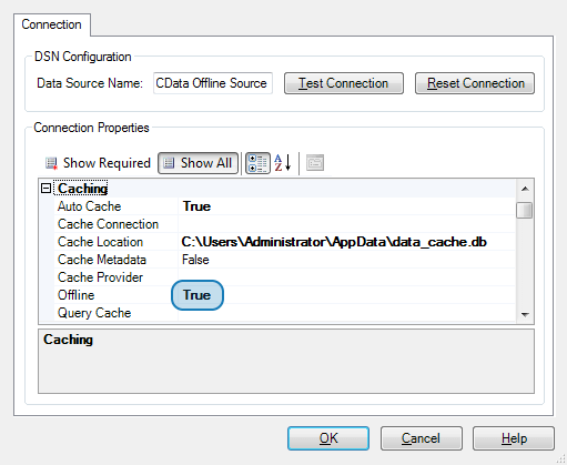 In order to cache the data, we need to set the caching connection properties for the driver. Depending on which technology you are using this can mean modifying the connection string programmatically or using a connection wizard to modify the connection properties. Below you'll find a sample connection that includes basic caching configuration: