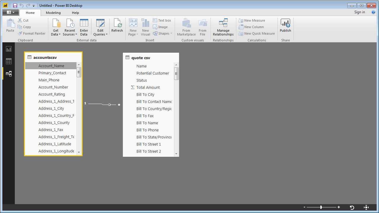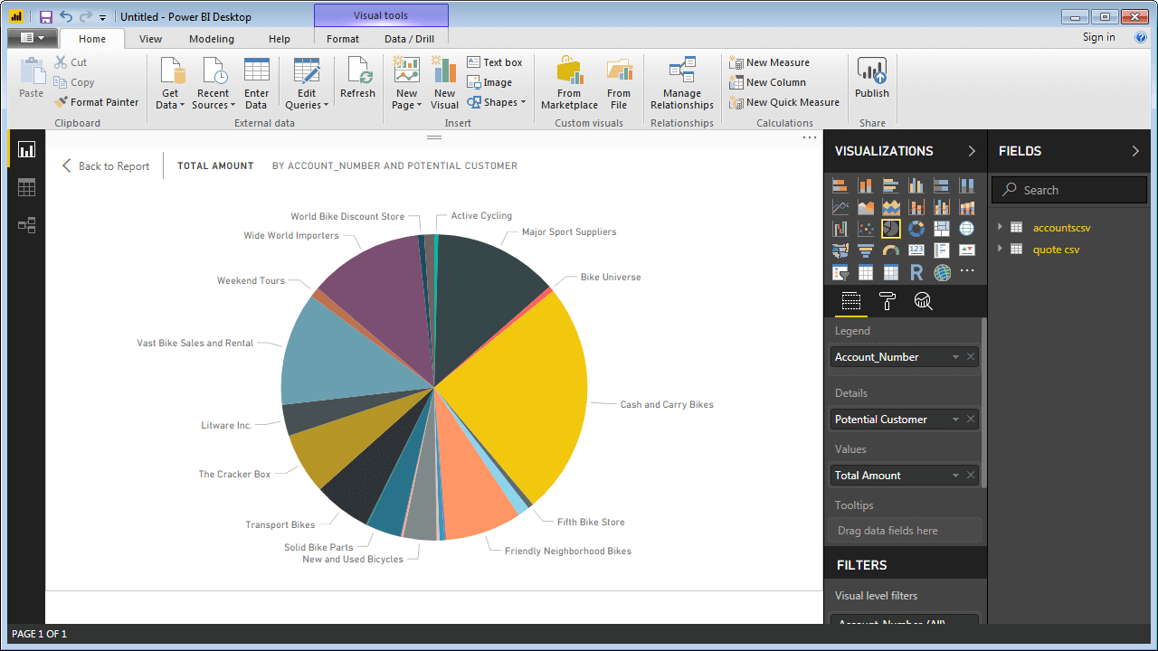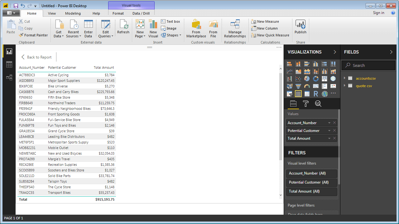 - Choose the [acountcsv.Account_Number], [quotecsv.Potential_Customer], and [quotecsv.Total_Amount] fields as the values for the Table. You should see repeated Account_Number and Potential Customer values. Under the Values, select Total Amount and choose Sum as the summary type.