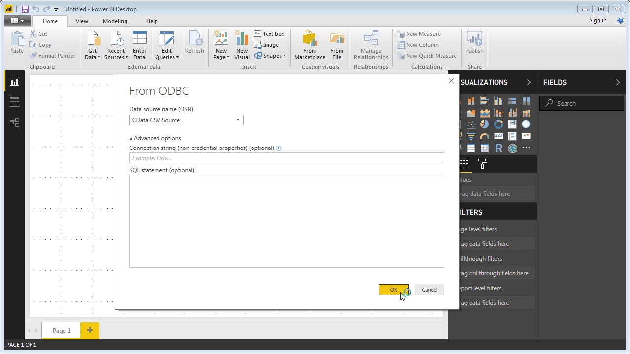 - Select the DSN you previously configured. If you know the SQL query you want to use to access the data, expand the Advanced Options node and enter the query in the SQL Statement box (each CSV file in the directory is treated like a table, with columns and rows).