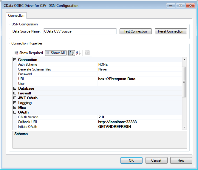 To connect with CSV files stored in Box in Power BI, you will need to install the ODBC Driver and configure a DSN. To bind to a remote directory as a database, set the URI connection property based on the service you are connecting to and the path to the directory. The ODBC Driver uses OAuth to authenticate with Box, so you will need to set connection properties based on values from a new or existing Box application created with a Box developer account. Review the Getting Started -> Connecting to Box section of the Online help for more information.