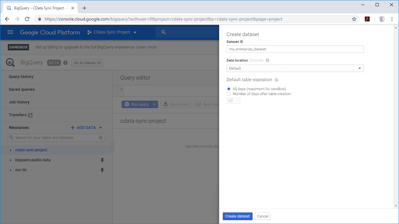 To replicate enterprise data to Google BigQuery using CData Sync, you will need a project in the Google Cloud Platform and a dataset in your project. With both of those in place, CData Sync manages the rest of the replication, from creating new tables to updating existing tables with new data entries.