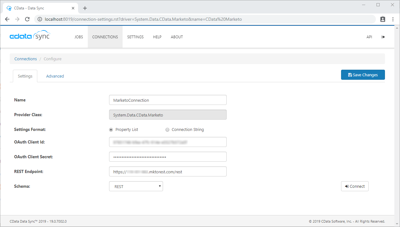 CData Sync is able to connect to your Marketo data using either the REST or SOAP API. In either case, only a few properties are required to connect. For more information on connecting to Marketo from CData Sync, refer to our help documentation (accessible from the CData Sync page).