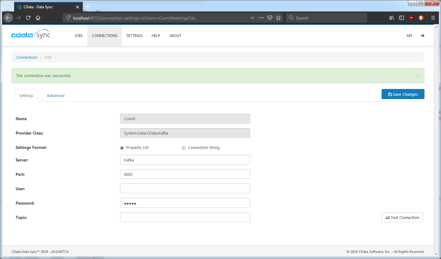 Specify the Server and Port properties. If authentication is enabled, specify the "User" and the "Password" properties as well. Click "Save Changes" and "Test Connection" to save your changes and ensure CData Sync can connect to the Kafka Server.