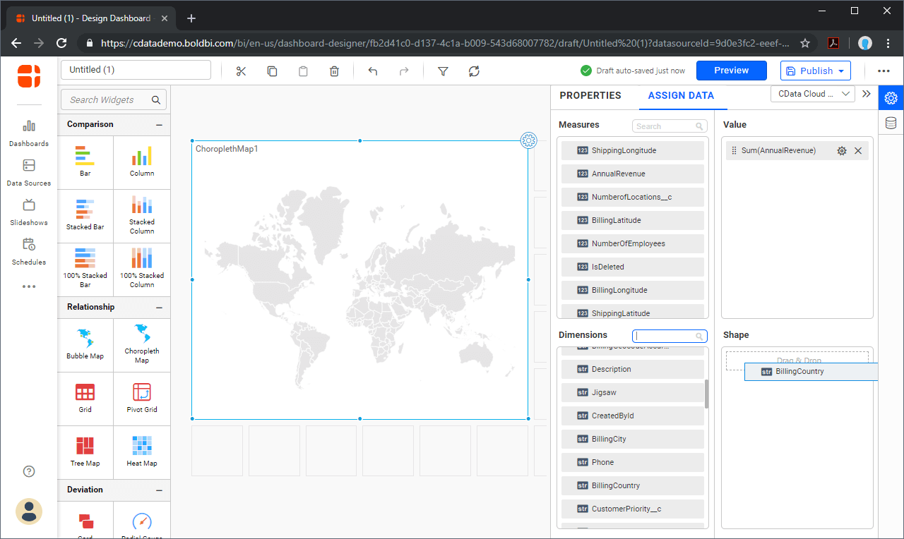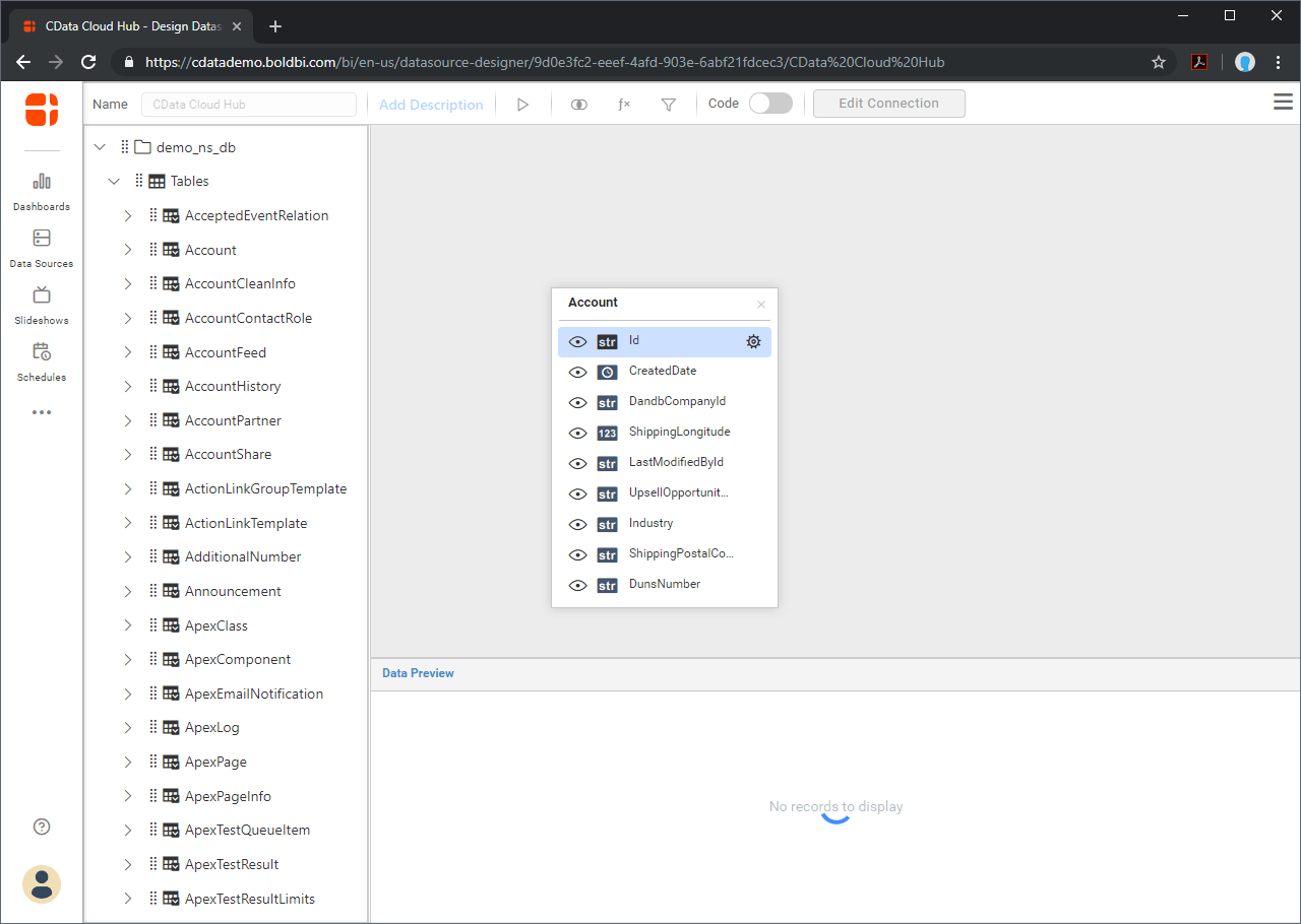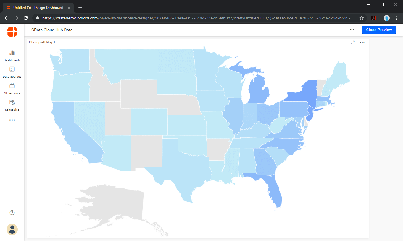 Bold BI is an online solution for creating, managing, and sharing interactive business dashboards. When paired with CData Connect, customers can use Bold BI to build responsive dashboards with access to live data from dozens of SaaS, Big Data, and NoSQL data sources. Connect creates a virtual MySQL database for each connected data source that is easily and intuitively accessible from Bold BI.