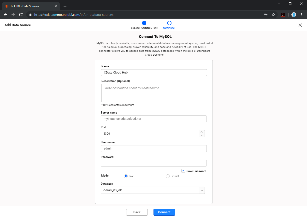 Once you have created the virtual database, connecting to your data from Bold BI is as simple as using the built-in CData Connector.