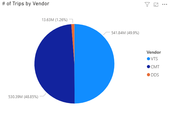 Our first visualization is a pie chart, counting the number of trips by each vendor in the dataset. If we were importing the data, all 1 billion+ trips would need to be imported, grouped, and counted on the client side. Instead, thanks to DirectQuery, Power BI asks Google BigQuery to perform the grouping and counting. With this query, Power BI is now only responsible for building a visualization from 3 rows of data (1 row per vendor), instead of over 1 billion rows.