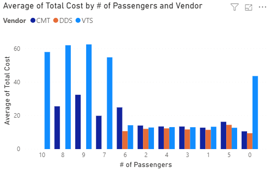 Our next visualization calculates the average total cost of each trip, grouped by the number of passengers and the vendor. For additional complexity, we filtered only those trips with 0 to 10 passengers. Again, instead of requiring local resources to manage 1 billion rows, Power BI asks BigQuery to perform the averaging, grouping, filtering, and ordering. With all of the complexities involved, Power BI is only responsible for charting 33 rows of data (3 vendors times 11 different numbers of passengers).