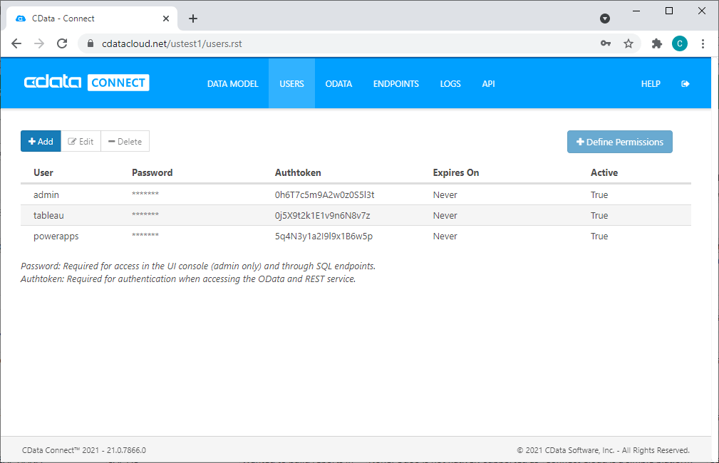You can also create users within CData Connect with varying levels of permissions to access data, or specify users for each data source. These are the user profiles you will use to access CData Connect from your BI and analytics platforms, offering another layer of data access management.