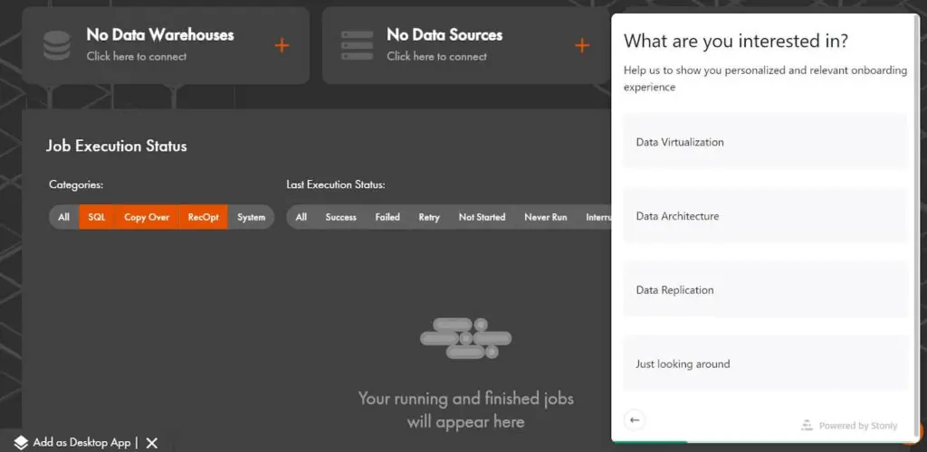 The new update will have an improved user experience. With the Stonly integration, onboarding is now even more tailored to what the user needs to get started in CData Virtuality SaaS.