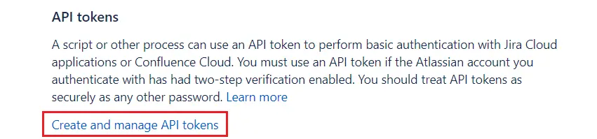 - Obtain a Jira API token: In your Jira settings, under “Manage Account,” generate an API token from “Create and manage API tokens.”