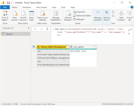 Clicking on Transform data will open the following dialog box and create a parameter-based query. I’m not going to dive into much detail since the articles I’ve listed in references does a much better job of explaining how.