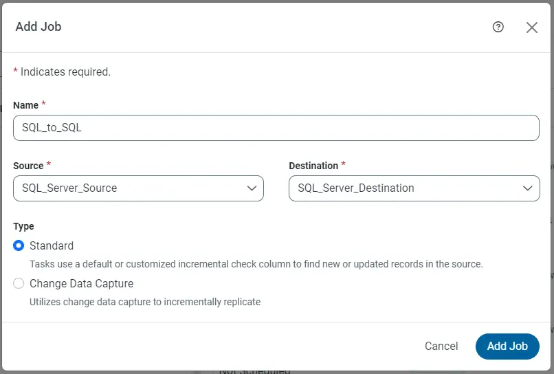 CData Sync enables you to control replication with an easy-to-use point-and-click interface and SQL queries. For each replication you want to configure, navigate to “Jobs” and click Add Job. Select the Source and Destination for your replication.