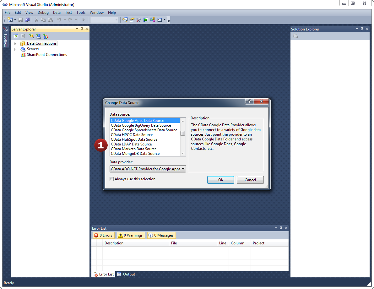 It's easy. As a standard ADO.NET adapter, developers can connect the Server Explorer to CSV ADO.NET Provider just like connecting to any standard database.