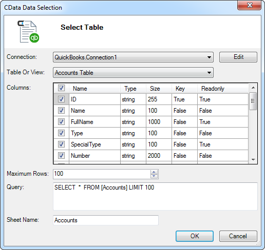 Create connections to the two QuickBooks companies. To create a new connection, click the From QuickBooks button on the CData ribbon and then click Edit in the Data Selection dialog. Make sure you enable updates and inserts in the Connection Wizard that is displayed.