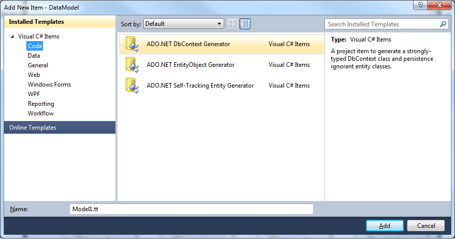 - Right-click on the entity diagram and select 'Add Code Generation Item'. Next, select the ADO.NET DbContext Generator.