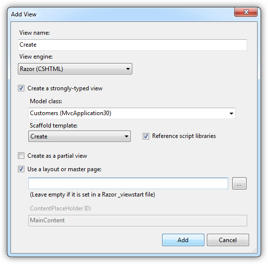 - Model class: In the menu, select the entity, Customers (MvcApplication.Models).