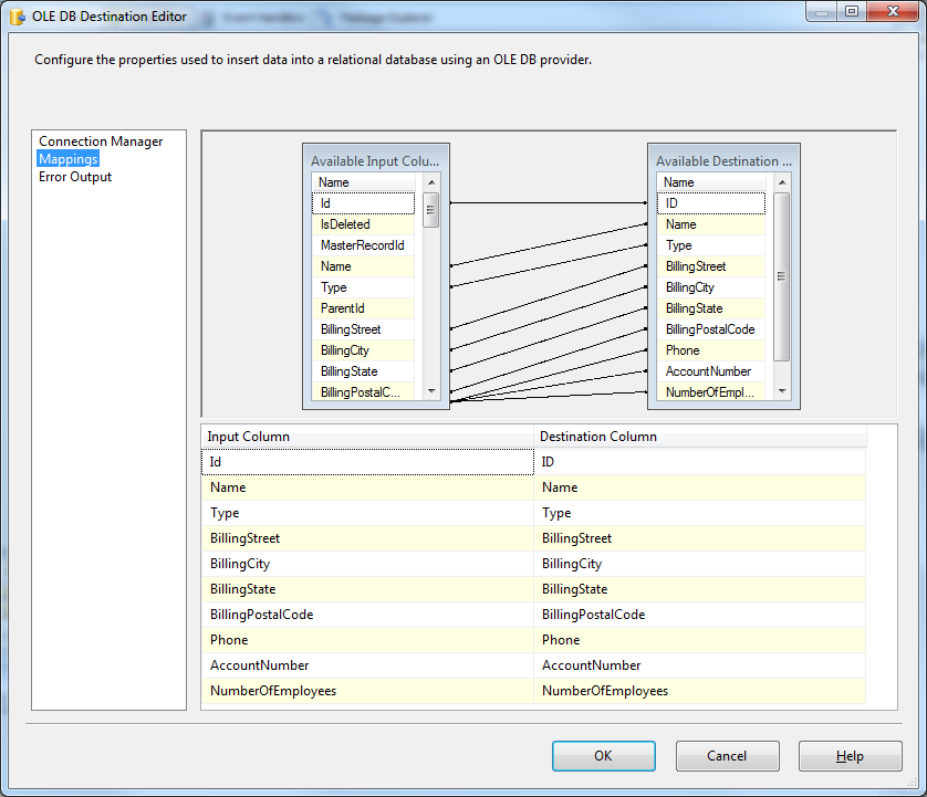 - Close the OLE DB Destination Editor and run the project. After the SSIS Task has finished executing, your database will be populated with data obtained from Salesforce.