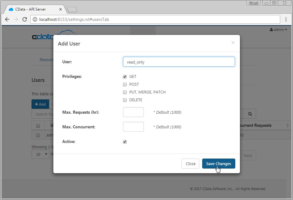 Next, create a user to access your database data through the API Server. You can add and configure users on the Users tab of the SETTINGS page. Since we are only creating a simple SPA for viewing data, we will create a user that has read-only access. Click Add, give the user a name, select GET for the Privileges, and click Save Changes.