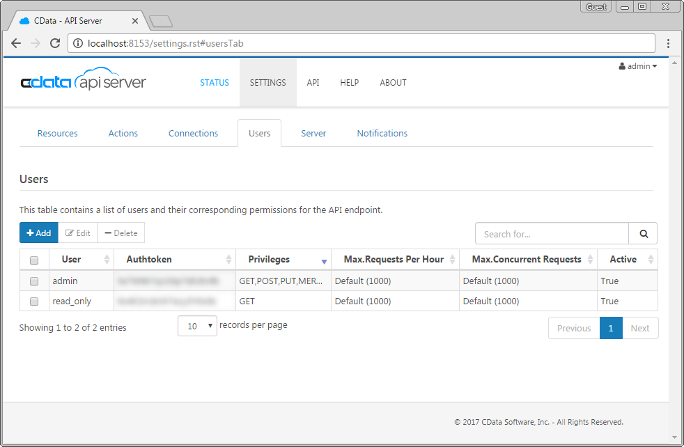 As you can see in the screenshots, we already had a user configured with read and write access. For this article, we will access the API Server with the read-only user, using the associated authtoken.