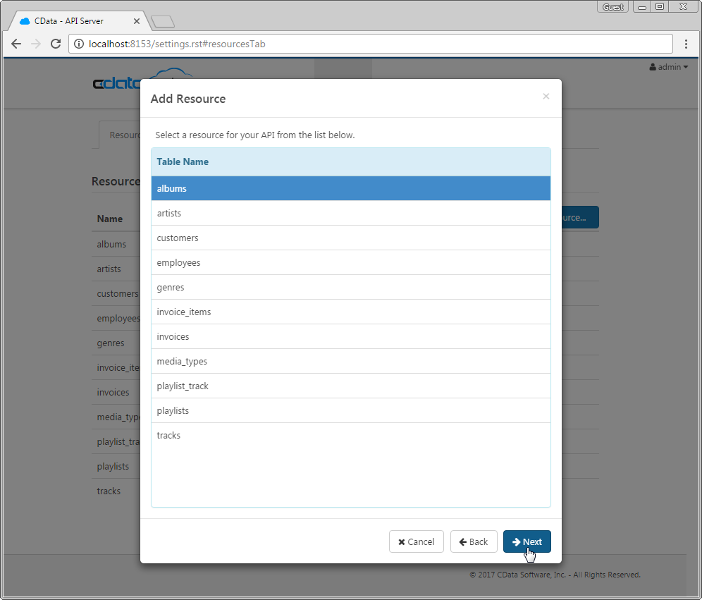 Having created a user, we are ready to enable access to the database tables. To enable tables, click the Add Resources button on the Resources tab of the SETTINGS page. Select the data connection you wish to access and click Next. With the connection selected, you can begin enabling resources by clicking on a table name and clicking Next. You will need to add resources one table at a time. In this example, we enabled all of the tables.
