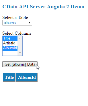 Once the table and columns are selected, you can click the Get [table] Data button to retrieve data from your database via the API Server. The HTML table will be populated with data based on the table and columns you selected before clicking on the button.