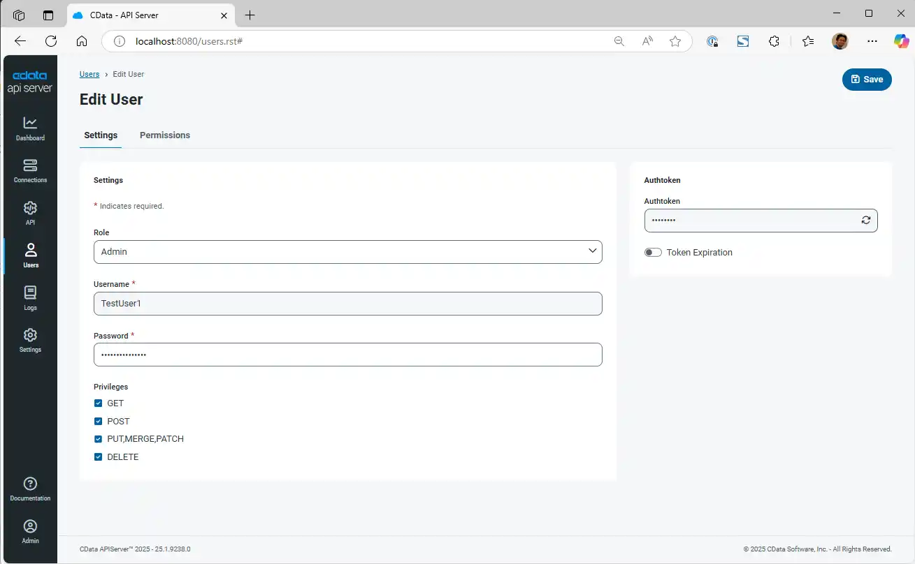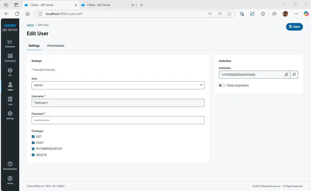 Password: the Authtoken generated for the user in API Server