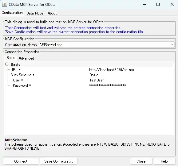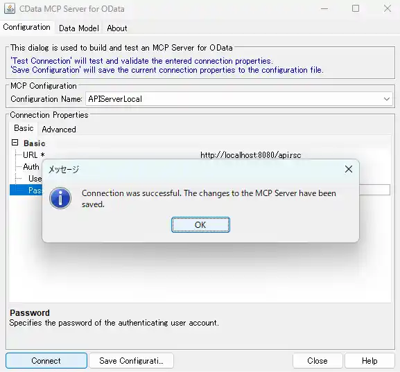 - Click "Connect" in the MCP Server configuration window and it will test the connection to API Server. When successful, the configuration information is stored in MCP Server config file. Click "close" to close the window.