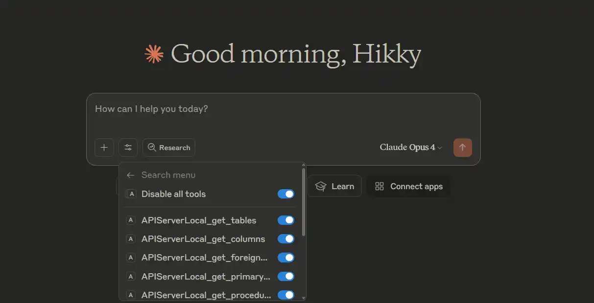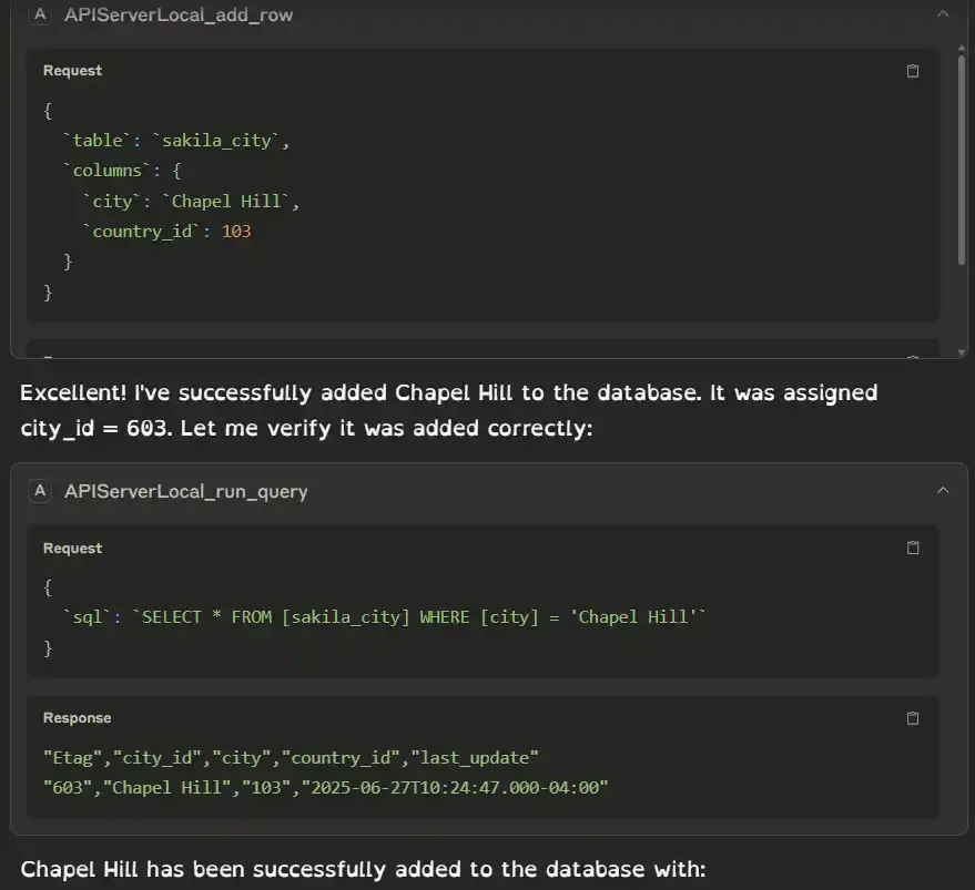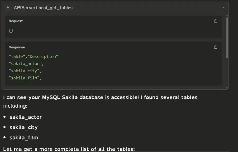 - The MCP Server successfully returns the table exposed in API Sever.