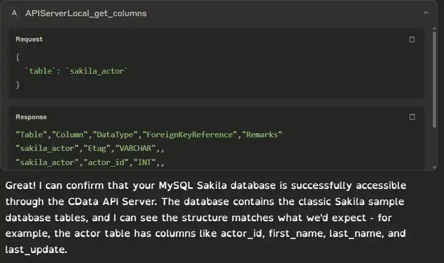 Natural language question: Can I see my MySQL Sakila database through CData API Server?