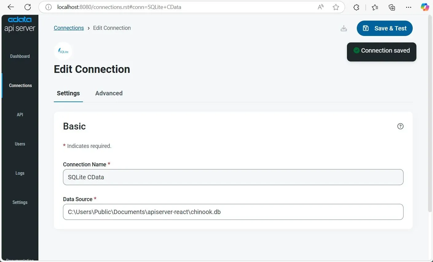 - Database Source: Enter the full path of the sample chinook.db SQLite database file included in the project ZIP. For example: C:\Users\Public\Downloads\apiserver-react\chinook.db