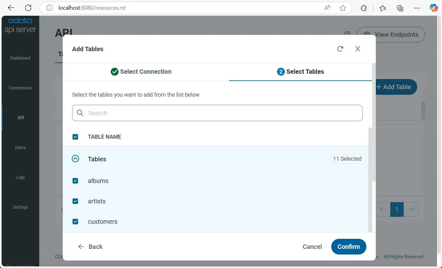 - Select tables by toggling-down Tables, or click the top checkbox to select all, then click Confirm to add them.