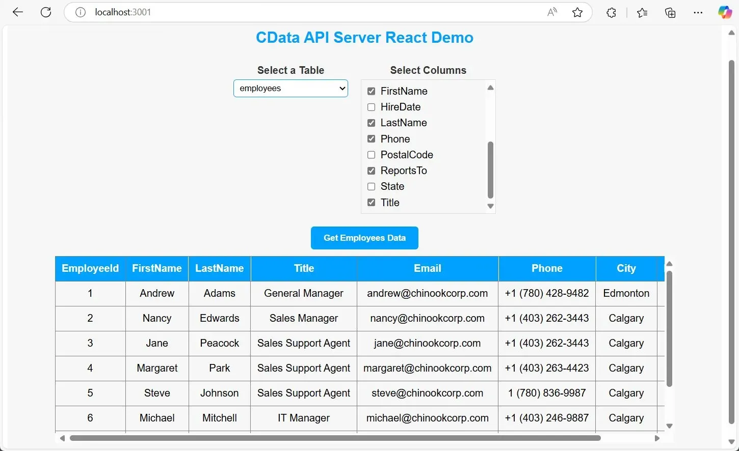 Note: The port number for the app is updated to 3001 to avoid conflicts with the CData API Server, which uses port 8080 by default. You can change this port in the webpack.config.js file if needed.
