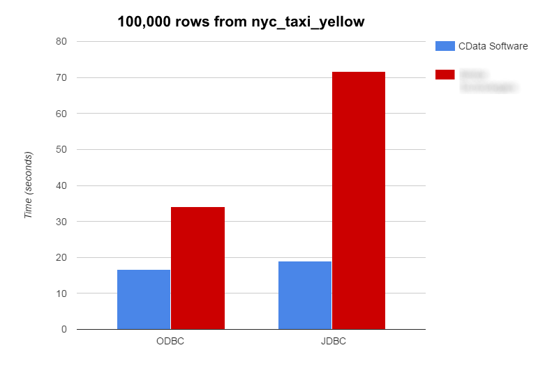 This article will serve to compare the Google-supported ODBC Driver for Google BigQuery 2.0.6.10111 to the CData Software ODBC Driver for Google BigQuery 20162 and the Google-supported JDBC Driver for Google BigQuery 1.0.6.10081 to the CData Software JDBC Driver for Google BigQuery 20163. In order to provide a reproducible comparison, we copied the trips table from the yellow dataset in the public nyc-tlc project4 (table ID: nyc-tlc:yellow.trips) to a private dataset. For clarity, we renamed the test table to nyc_yellow_trips.