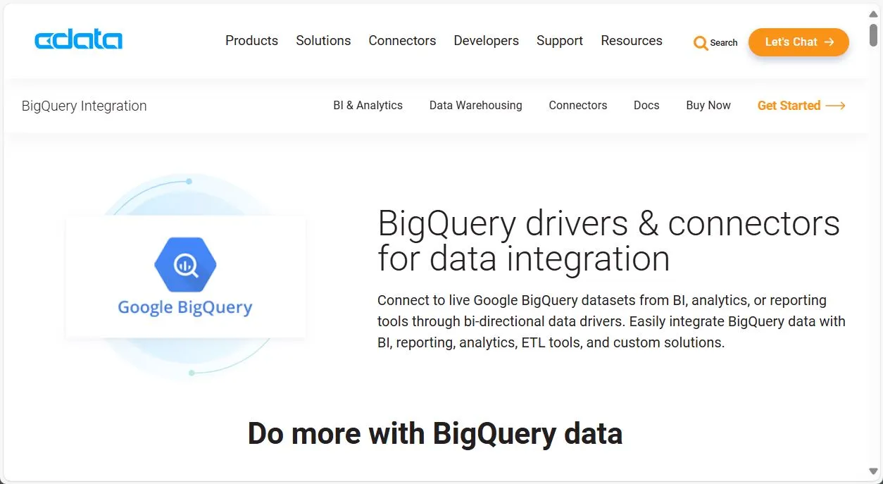 CData delivers powerful BigQuery Drivers for JDBC, ODBC, ADO.NET, and Excel, enabling seamless connectivity to Google BigQuery. Easily integrate live BigQuery data to and from your BI, analytics, ETL workflows, and custom applications.