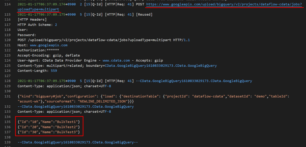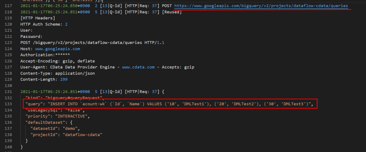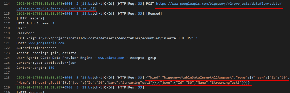 You can see that the driver invokes the insertAll API method, sending records as JSON in the request body.