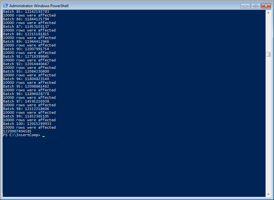 Below, you can see the results of loading one million rows in 100 batches (the maximum number of rows per batch is 10,000), printing the number of nanoseconds for each batch, along with the total number of nanoseconds required to insert the entire set (approximately 20 minutes, 20 seconds):