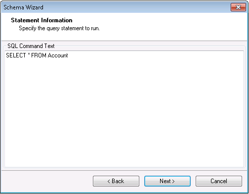 In the SQL Command Text box on the Statement Information page, enter an SQL command. (If you have configured the adapter in a receive location or send port, the SQL command you configured is entered in the box.) This example uses the query below: