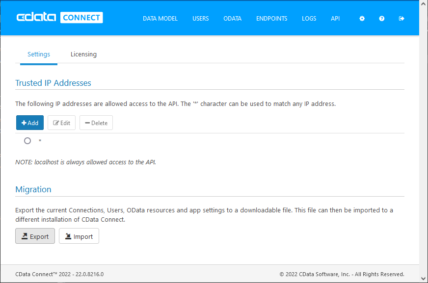 CData Connect provides a variety of endpoints for accessing all of your data. In some situations, you may need to re-install an existing configuration on a new machine or distribute your installations across multiple machines. In those cases, you can export the settings of one instance to be imported into another instance.