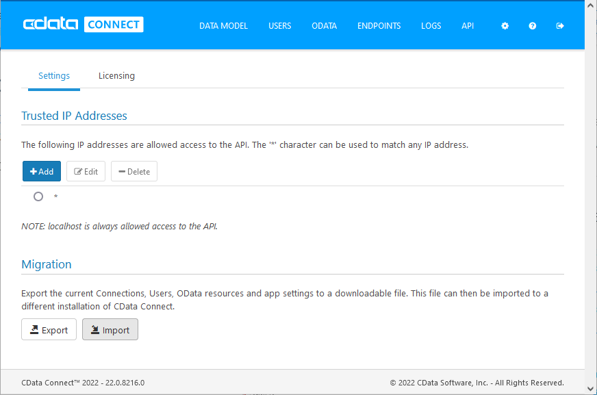 The Import feature is found on the Settings page of CData Connect. Click the gear icon () or navigate to https://my_connect_url/about.rst. Both the Export and Import buttons are found in the Migration section.