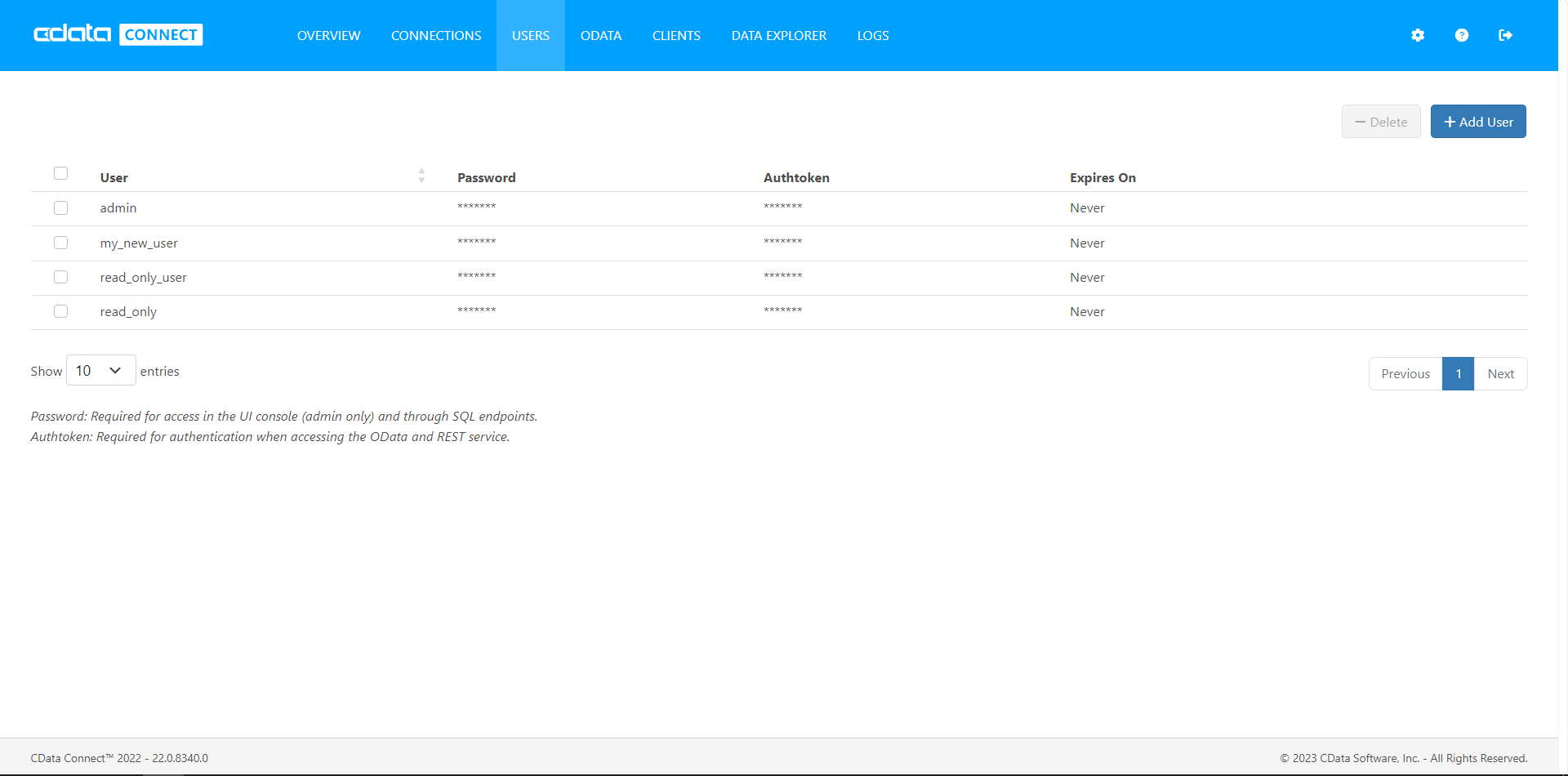 Next, create a user to access your database data through Connect Server. You can add and configure users on the Users tab. In this simple React app for viewing data, create a user that has read-only access: Click Add User, give the user a name and password, save the Authtoken for future use, and click Save Changes.