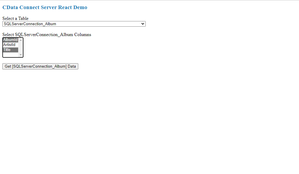 When the React app launches, the title and a drop down menu to select a table are displayed. The list of tables is retrieved from the Connect Server and includes all of the tables you added as resources when configuring Connect Server.