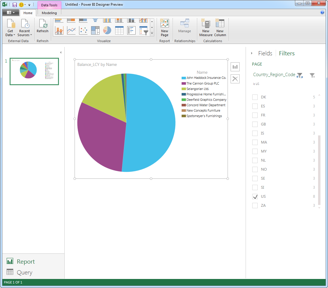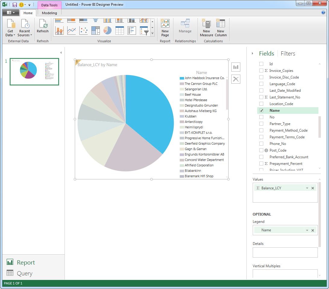 The data is displayed on the Query tab. Start creating the report on the Report tab. To create a visualization, drag a field from the Fields list onto the Report view. For example, to create a bar chart, simply click Name from the Customer table. The Power BI Designer selects the Balance_LCY column as the measure.