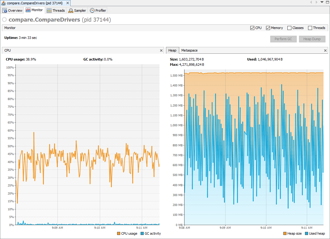 While testing the read performance, we also measured client-side resource usage, looking specifically at memory and CPU usage. The charts below were found by running a sample Java program and using Java VisualVM to capture the CPU and memory usage. We used Java version 8 update 211 with a maximum heap size of 4.27 Gigabytes.