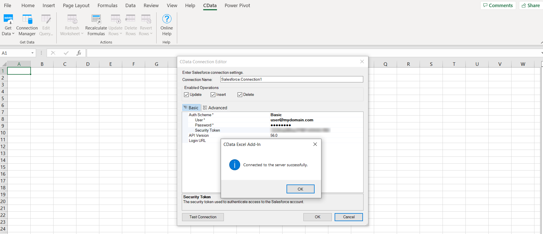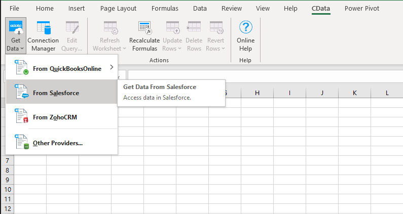 Open Excel and click the CData tab then Get Data -> From Salesforce
