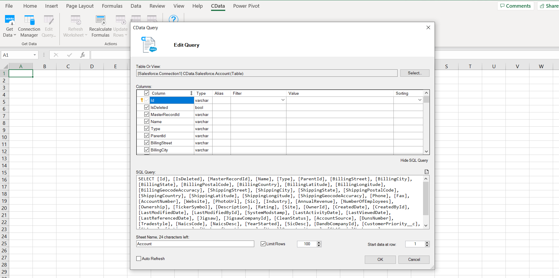Next, a SQL Query appears. This query populates the Excel spreadsheet with Salesforce data. Click OK.
