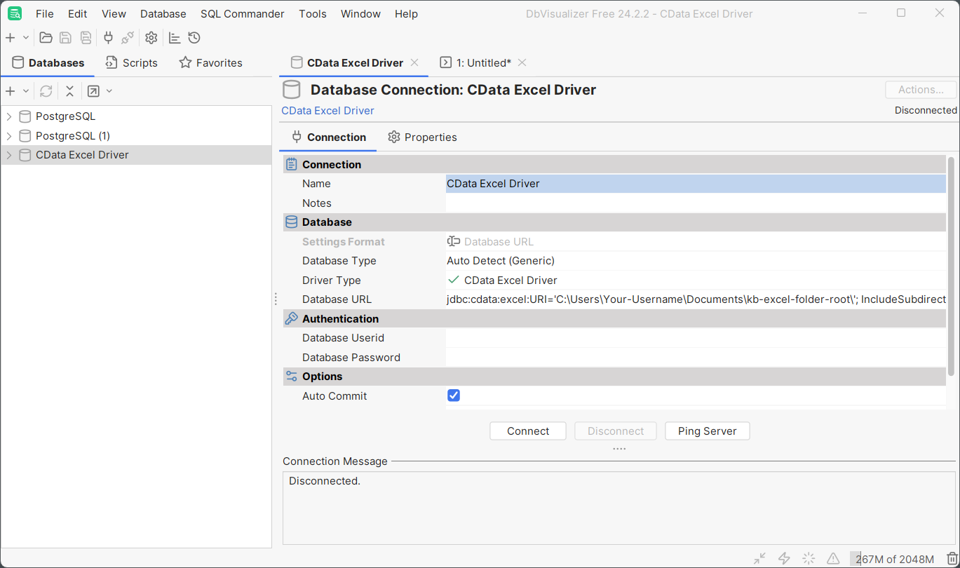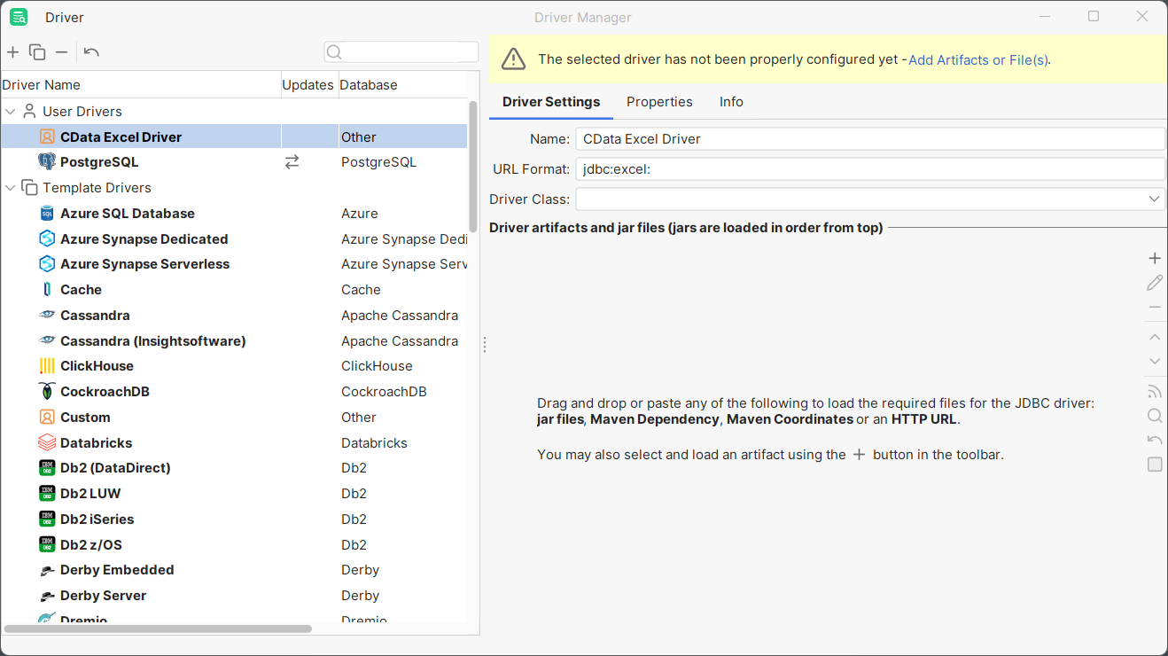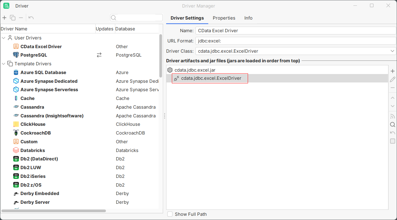 - The Driver Class should populate automatically. If not, select cdata.jdbc.excel.ExcelDriver.